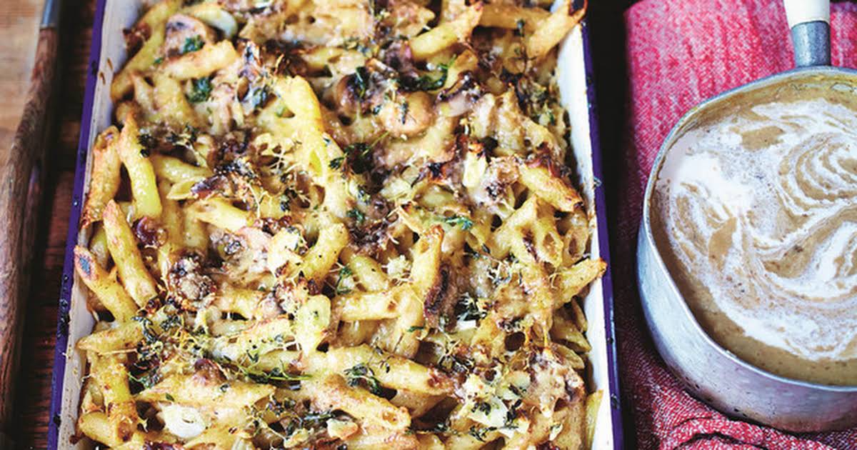 It's made with bacon, mushroom, cheese and a herb white wine cream sauce.